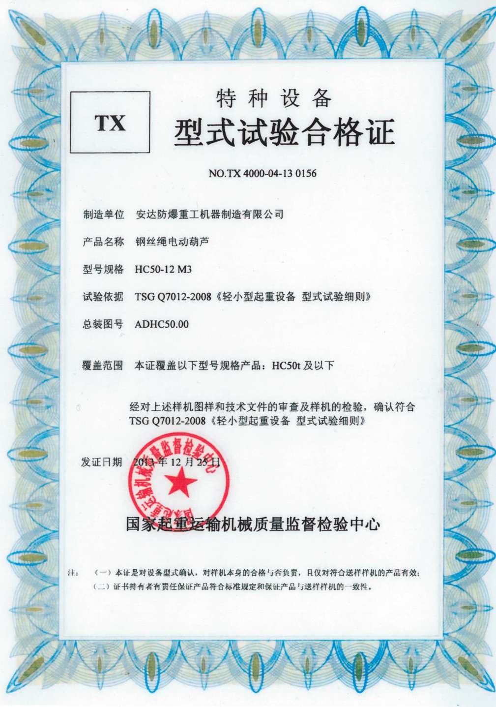 鋼絲繩電動葫蘆 TX型式試驗合格證