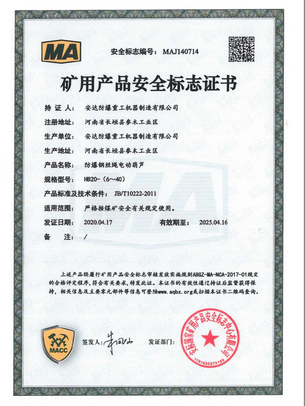 防爆鋼絲繩電動葫蘆 礦用產品安全標志證書