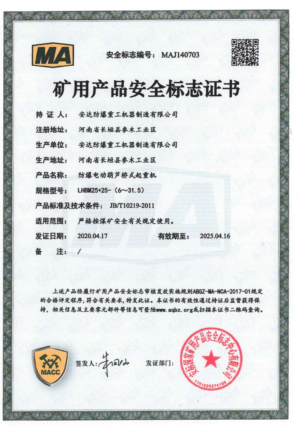 防爆鋼絲繩葫蘆橋式起重機 礦用產品安全標志證書