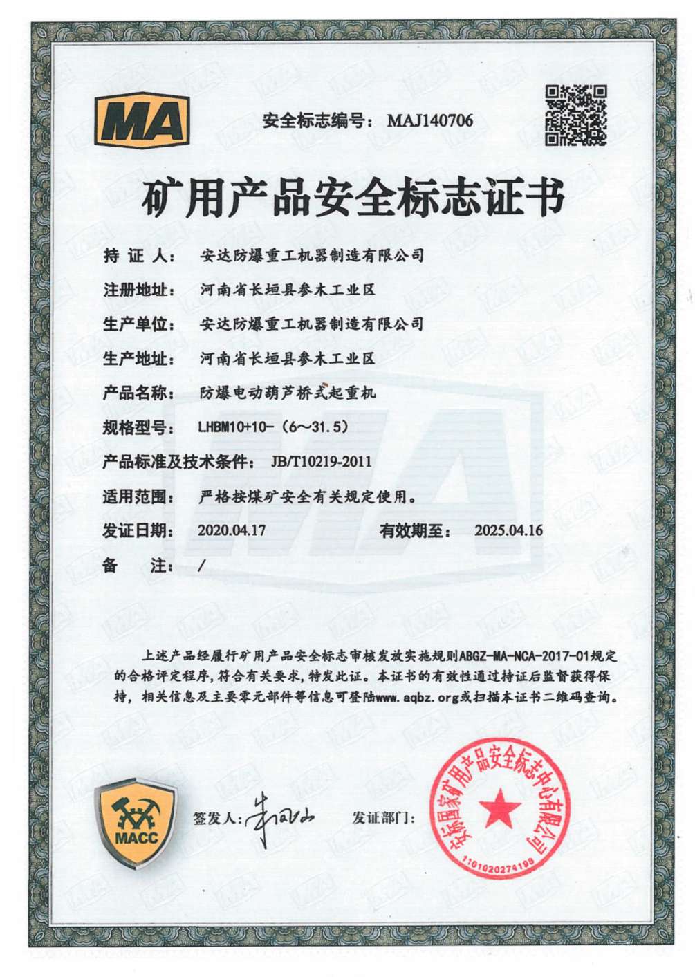 | 發(fā)證機(jī)構(gòu): | 安標(biāo)國家礦用產(chǎn)品安全標(biāo)志中心有限公司 | 發(fā)證時間 : | 2020-04-17 |