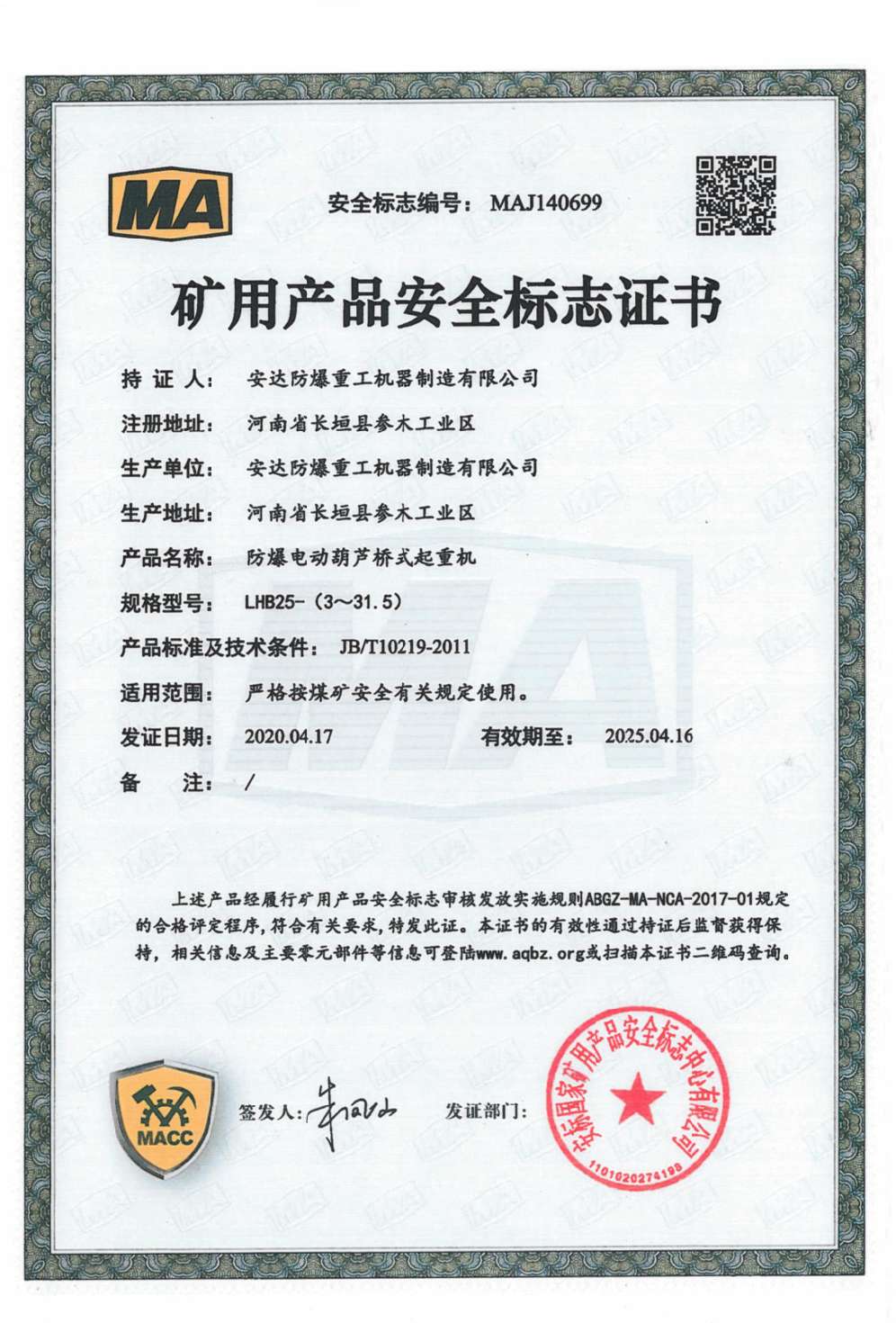 » 防爆鋼絲繩葫蘆橋式起重機 礦用產品安全標志證書