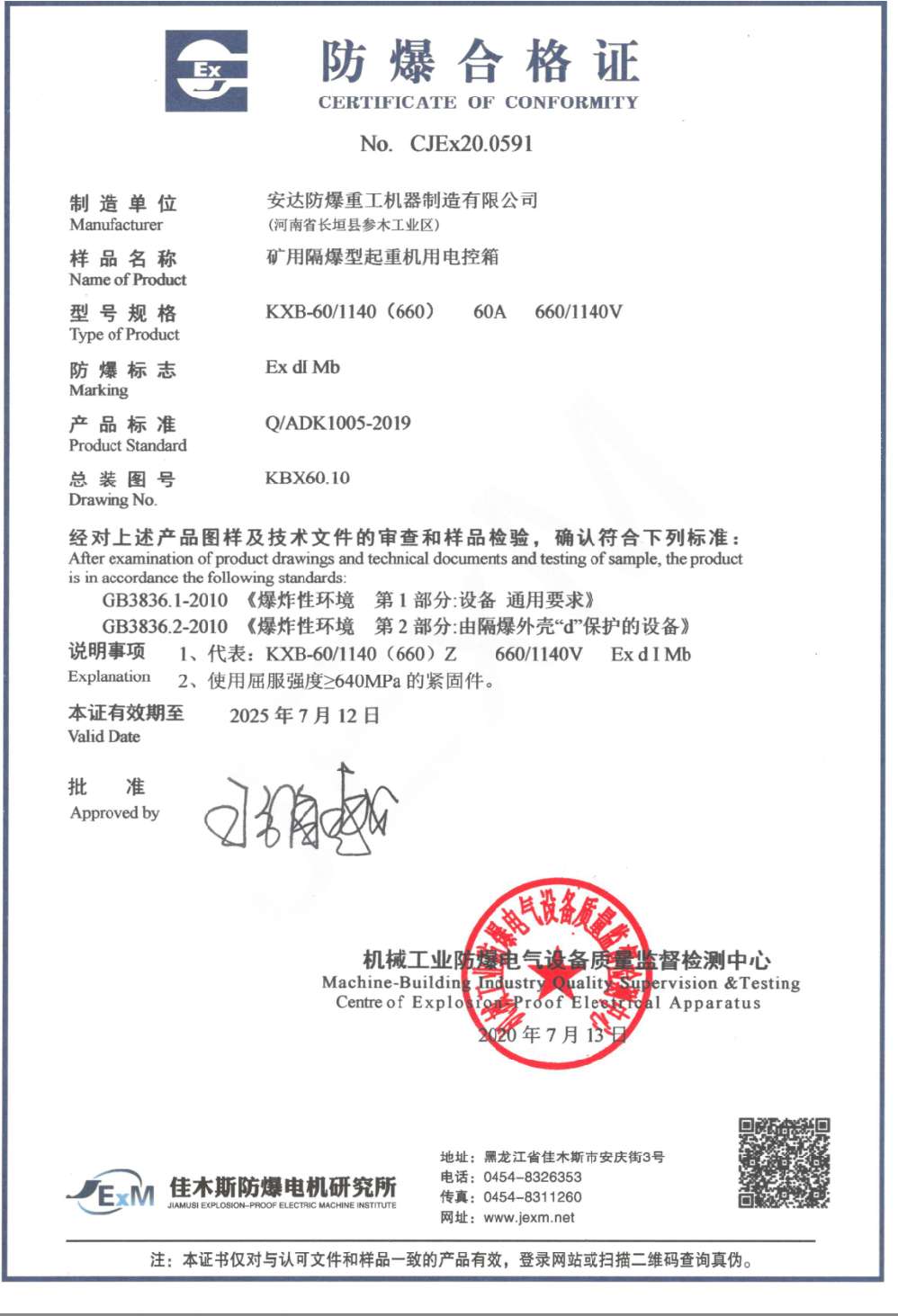 | 發(fā)證機(jī)構(gòu): | 機(jī)械工業(yè)防爆電氣質(zhì)量監(jiān)督檢測(cè)中心 | 發(fā)證時(shí)間 : | 2020-07-13 |