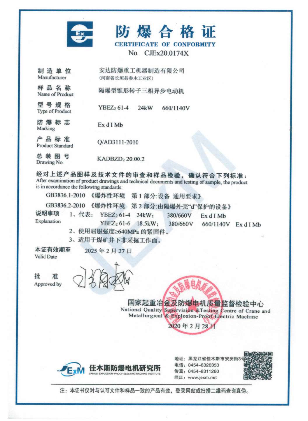 | 發(fā)證機(jī)構(gòu): | 國(guó)家起重冶金及防爆電機(jī)質(zhì)量監(jiān)督檢測(cè)中心 | 發(fā)證時(shí)間 : | 2020-02-28 |