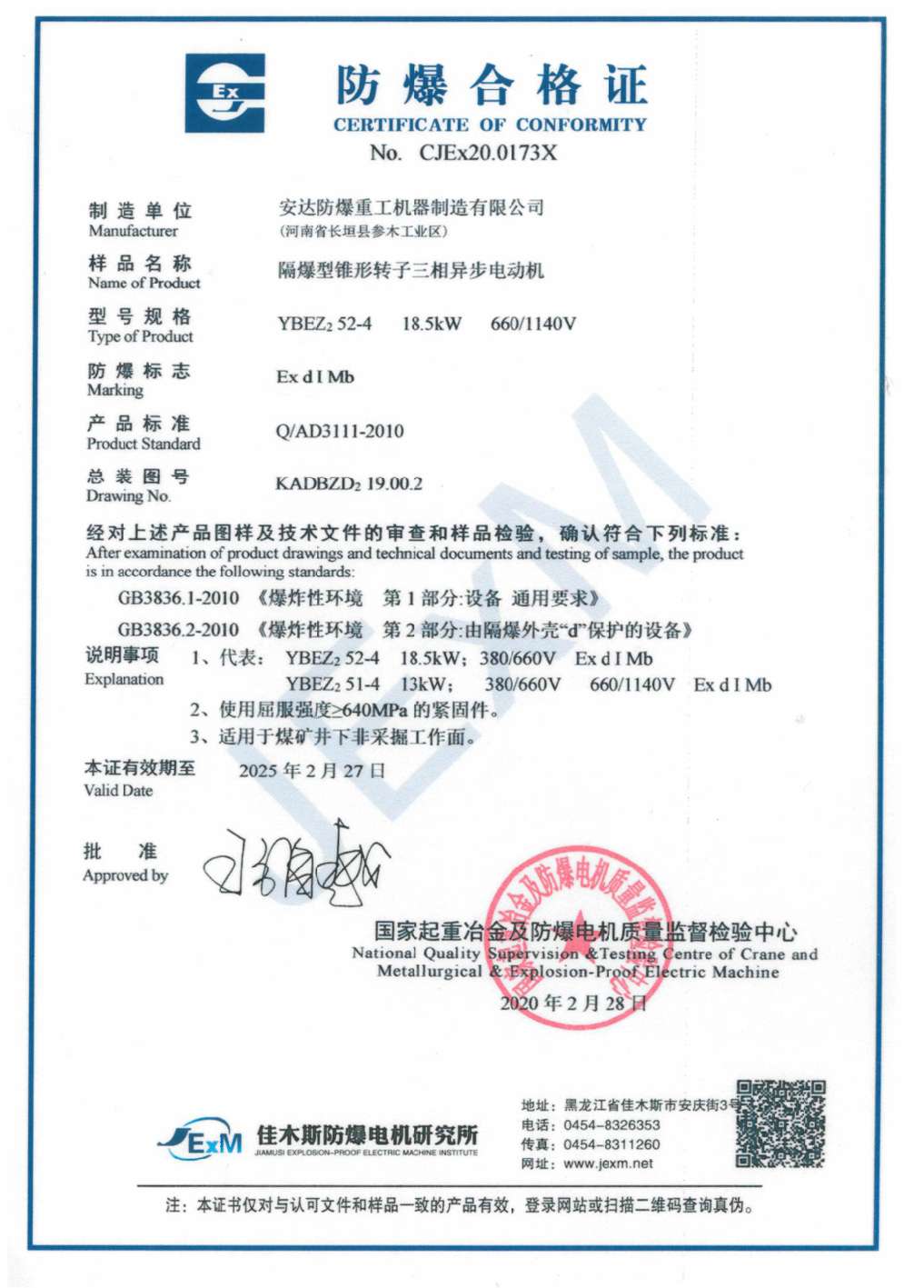 | 發(fā)證機(jī)構(gòu): | 國家起重冶金及防爆電機(jī)質(zhì)量監(jiān)督檢測中心 | 發(fā)證時間 : | 2020-02-28 |