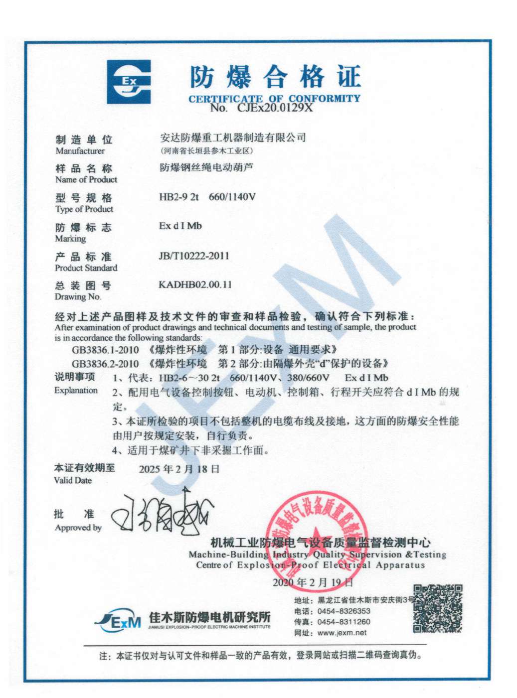 » 防爆鋼絲繩電動葫蘆 防爆合格證