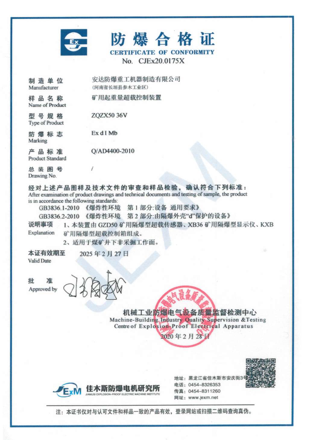 礦用起重機量超載裝置 防爆合格證