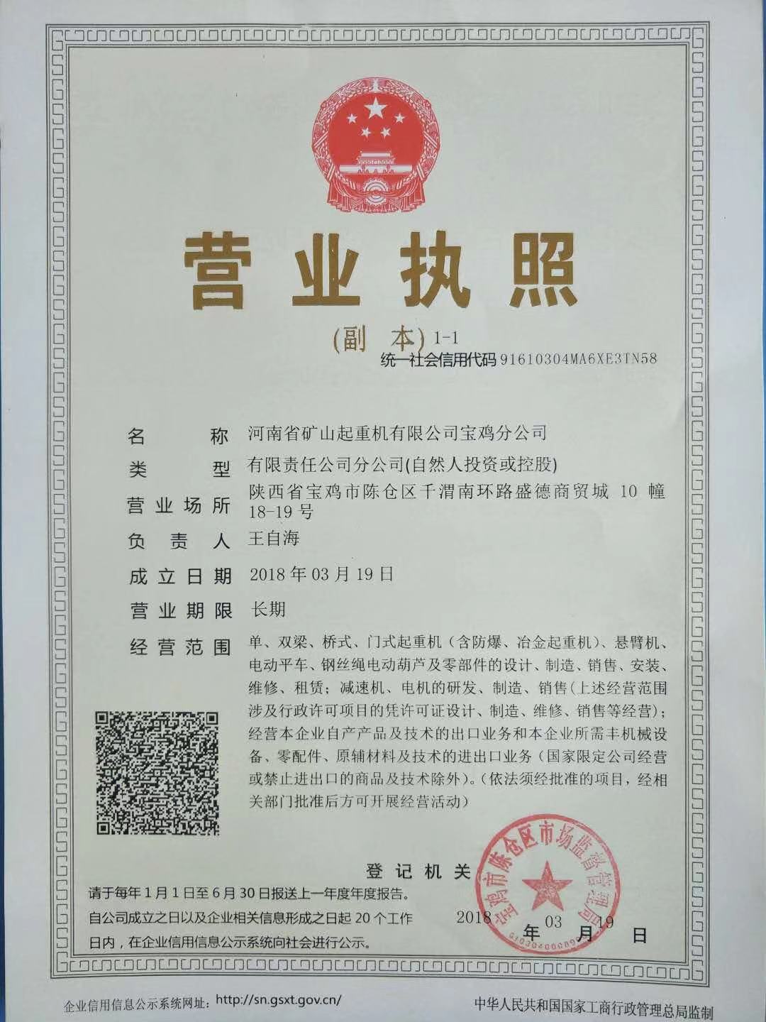 證書介紹 河南礦山起重機(jī)有限公司寶雞分公司營(yíng)業(yè)執(zhí)照