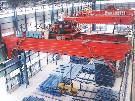 用于搬運(yùn)長(zhǎng)件板坯、棒材等黑色金屬。回轉(zhuǎn)通過(guò)兩種形式實(shí)現(xiàn),一種形式為掛梁回轉(zhuǎn),即掛梁為雙層結(jié)構(gòu),上層掛梁通過(guò)滑輪組與鋼絲繩纏繞,下層掛梁配有多臺(tái)電磁吸盤或夾鉗,可隨驅(qū)動(dòng)機(jī)構(gòu)回轉(zhuǎn)一定角度。另一種形式為小車回轉(zhuǎn),即小車為雙層結(jié)構(gòu),上層小車布置有起升機(jī)構(gòu),下層小車為運(yùn)行小車,上面鋪設(shè)有環(huán)形軌道,上層小車可沿環(huán)形軌道回轉(zhuǎn)。