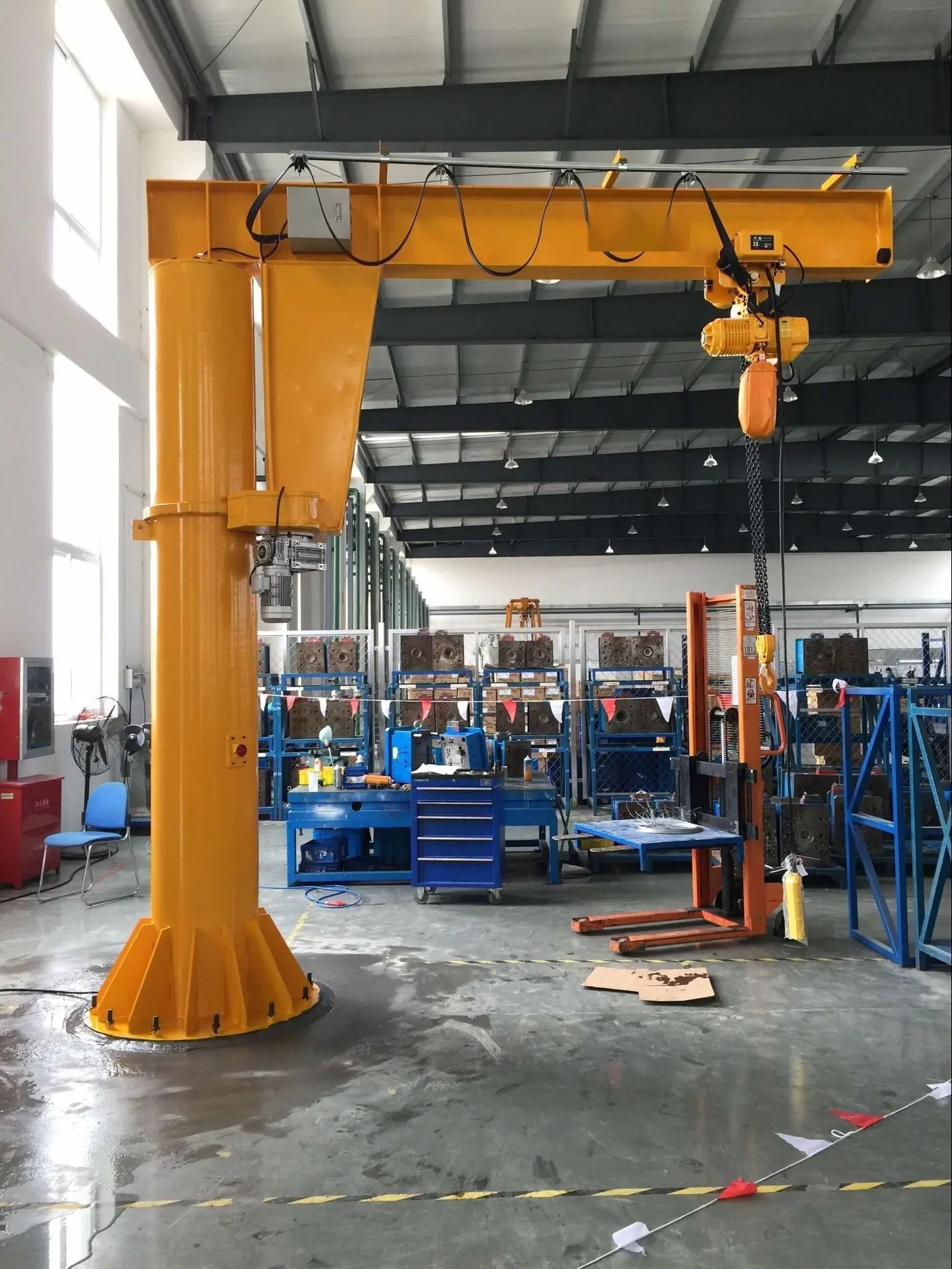 本產品廣泛用于各種行業的不同場所。懸臂起重機工作強度為輕型,起重機由立柱,回轉臂回轉驅動裝置及電動葫蘆組成,立柱下端通過地腳螺栓固定在混凝土基礎上,由擺線針輪減速裝置來驅動旋臂回轉,電動葫蘆在旋臂工字鋼上作左右直線運行,并起吊重物。起重機旋臂為空心型鋼結構,自重輕,跨度大,起重量大,經濟耐用。