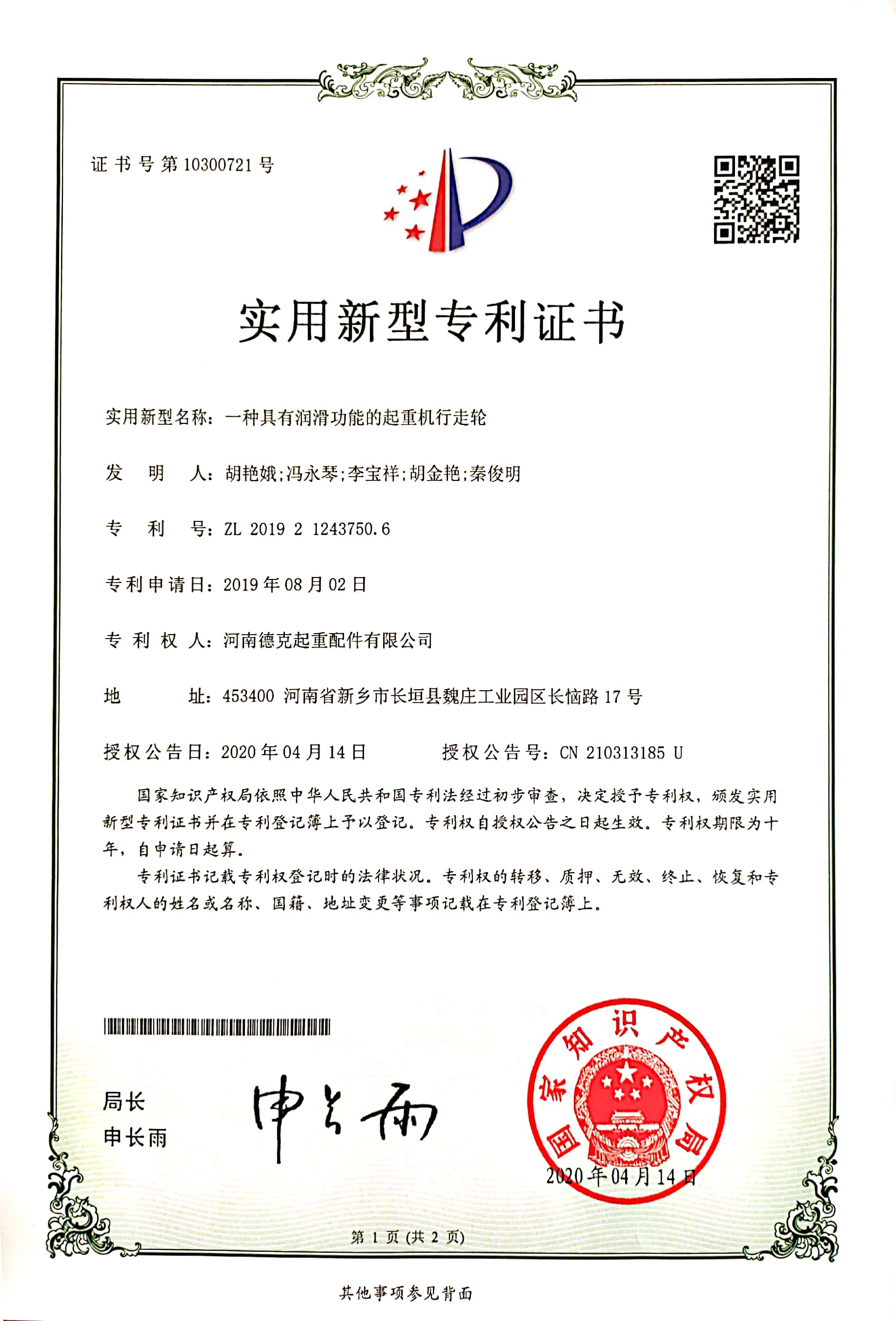 證書介紹 一種具有潤滑功能的起重機(jī)行走輪