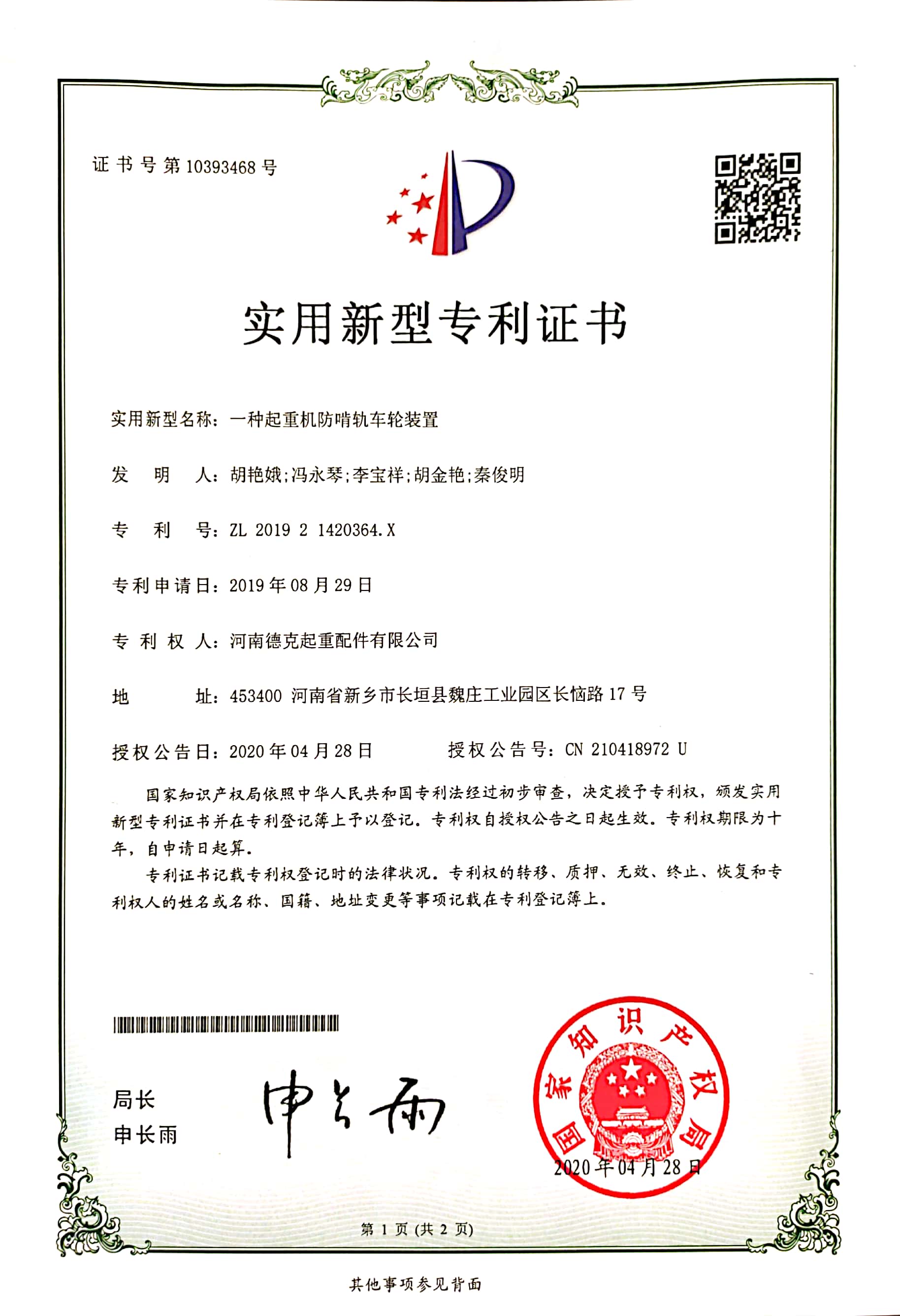 » 實用新型專利證書