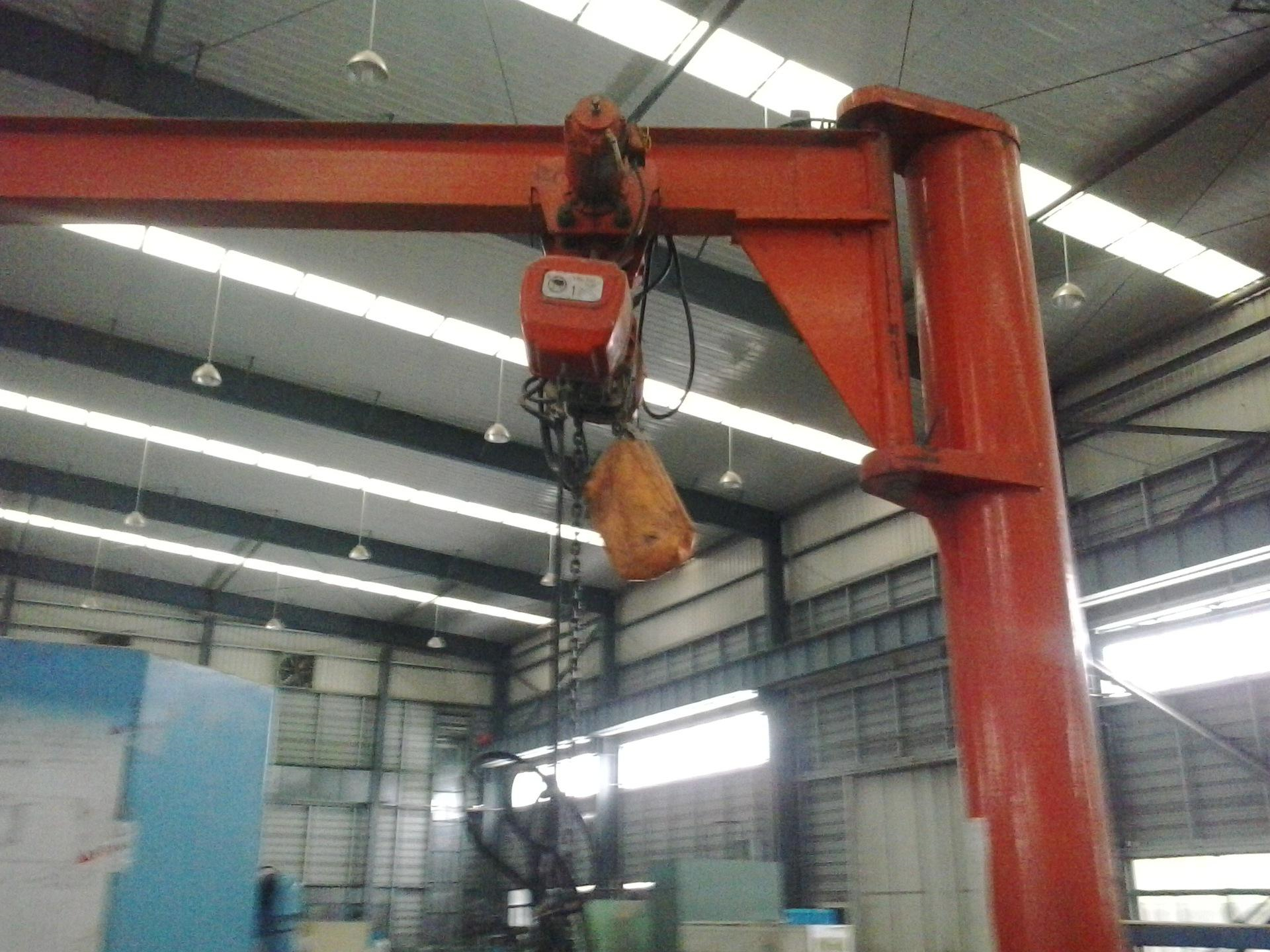 旋臂起重機工作強度為輕型,起重機由立柱,回轉臂回轉驅動裝置及電動葫蘆組成,立柱下端通過地腳螺栓固定在混凝土基礎上,由擺線針輪減速裝置來驅動旋臂回轉,電動葫蘆在旋臂工字鋼上作左右直線運行,并起吊重物。起重機旋臂為空心型鋼結構,自重輕,跨度大,起重量大,經濟耐用。內置式行旋臂吊MODE型走機構,采用帶滾動軸承的特種工程塑料走輪,摩擦力小,行走輕快;結構尺寸小,特別有利于提高吊鉤行程。