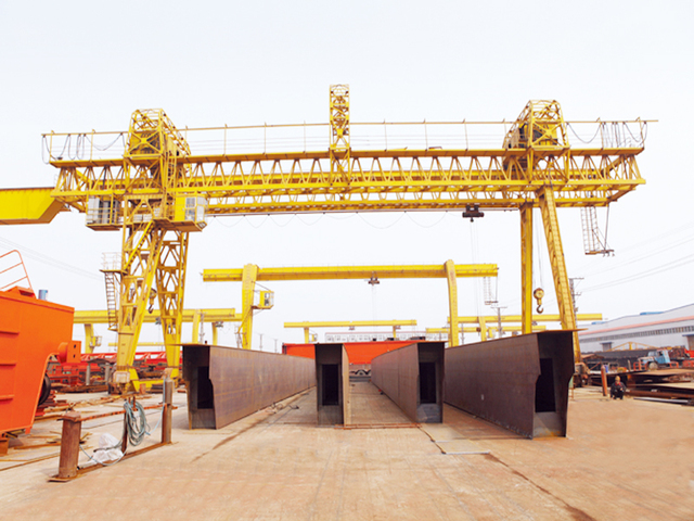 該門式起重機其主要用于橋梁建設,工作速度慢,由門架、卷揚機小車、大車運行機構、司機室和電氣控制系統組成。門架為桁架結構,具有結構輕、抗風力強等優點。包括主梁、上端梁、支腿、下端梁、走行臺車及走臺欄桿等。主梁采用三角桁架結構,上面鋪設有軌道,供小車沿主梁方向作橫向移動。支腿采用箱形或鋼管兩種形式。小車上布置有卷揚機,體積緊湊,自重輕。