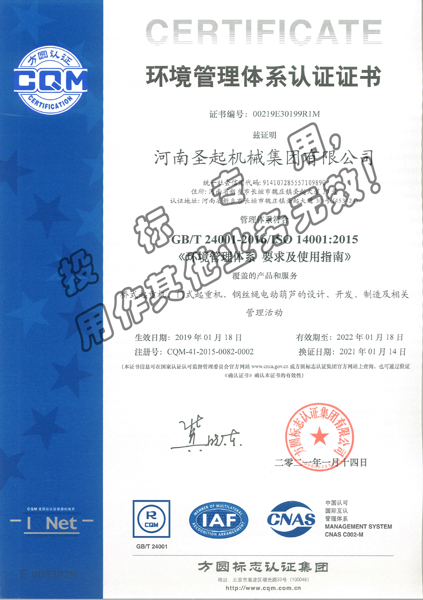 環(huán)境管理體系認證證書