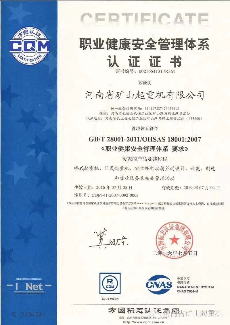 » 職業(yè)健康安全管理體系認證證書