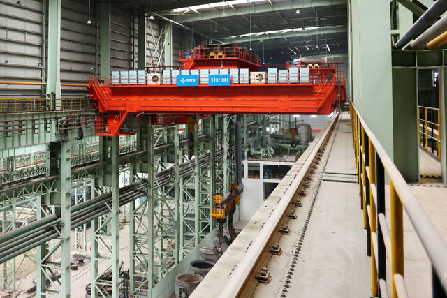 該產品采用四梁四軌雙小車結構型式,主體結構在垂直及水平載荷作用下,具有很好的強度和剛度。大車車輪采用20輪布置方式,力學模型簡單,輪壓分布均衡,可有效降低廠房鋼結構造價。 整機采用調速控制系統,運行平穩(wěn)、安全,起、制動沖擊小,同時起升調速裝置采用一用一備系統,當一套裝置發(fā)生故障時,可實現安全、快速切換,保證起升系統正常運行。 車輪組采用新系列標準45°剖分式鍛造車輪,具有承載能力高、防塵、使用壽命長、更換維護方便等特點。