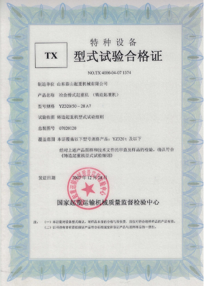 榮譽(yù)資質(zhì) 冶合橋式起重機(jī)(鑄造起重機(jī))