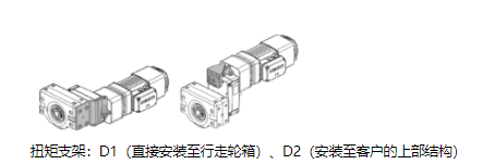 德馬格模塊化系統包含D1 扭矩支架(直接安裝至行走輪箱)或 D2 扭矩支架(安裝至客戶的上部結構),以適應驅動力矩傳送支持