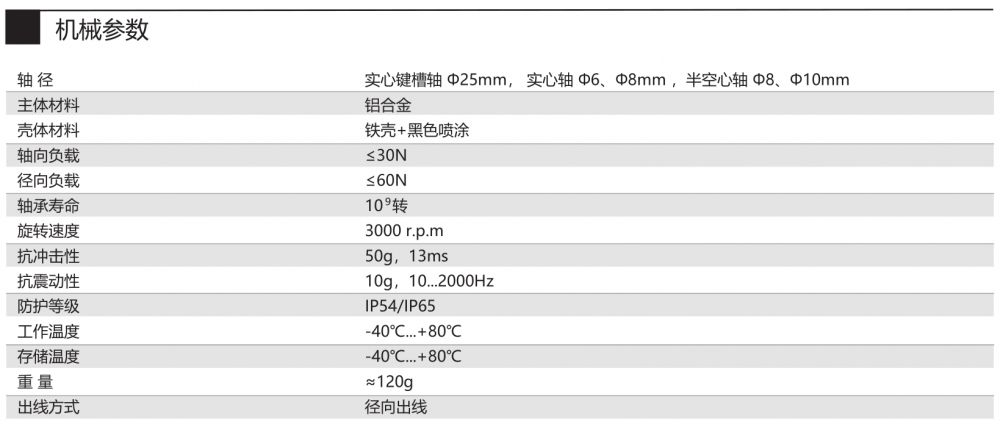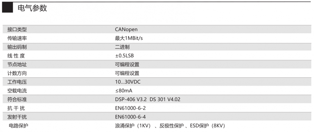 感應(yīng)原理 磁性 功能原理 多圈 多圈技術(shù) 機(jī)械齒輪組(無需電池) 外徑 Φ50mm 軸徑 實(shí)心鍵槽軸 Φ25 mm,實(shí)心軸 Φ6、Φ8mm 半空心軸 Φ8、Φ10mm 分辨率 22Bit 每圈步數(shù) 4096/12Bit 圈數(shù) 1024/10Bit 接口 CANopen 工作電壓 DC5V、DC10-30V 防護(hù)等級 IP54、IP65