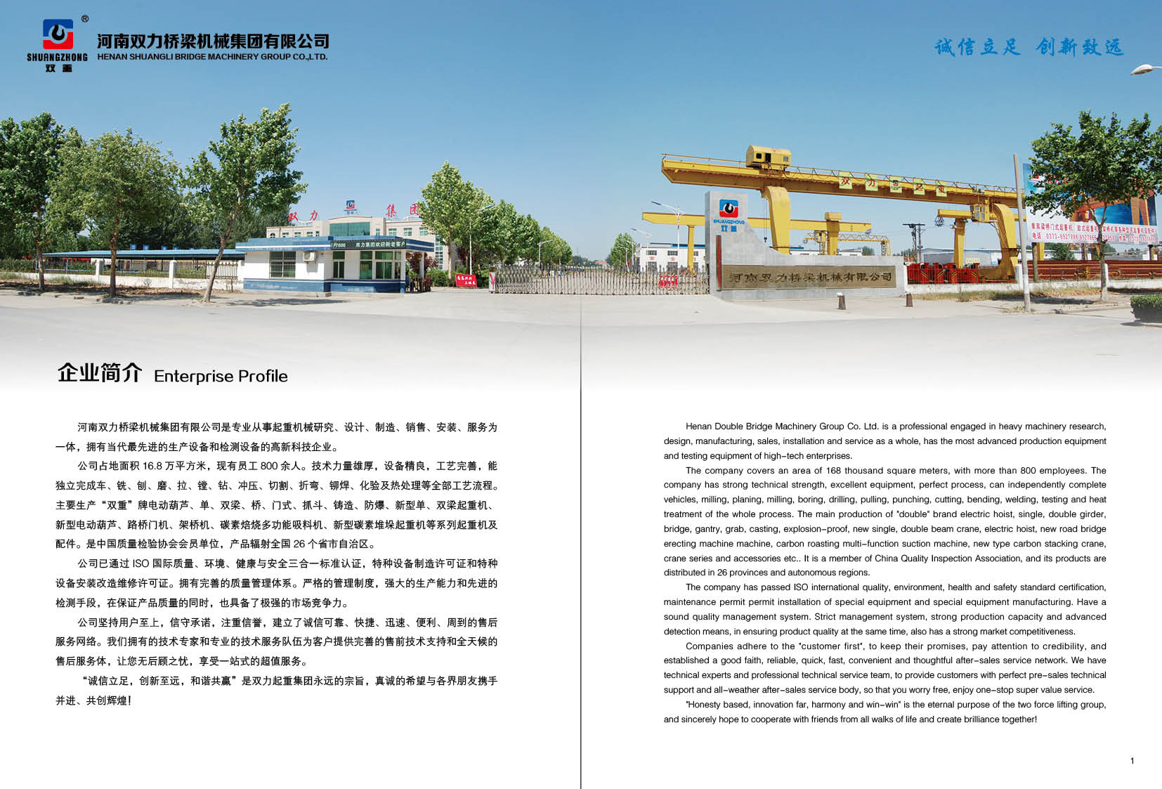 詳細(xì)信息 河南雙力橋梁機(jī)械集團(tuán)有限公司是專業(yè)從事起重機(jī)械研究、設(shè)計、制造、銷售、安裝、服務(wù)為一體,擁有當(dāng)代進(jìn)的生產(chǎn)設(shè)備和檢測設(shè)備的高新科技企業(yè)(下屬雙力新能源節(jié)能環(huán)保科技有限公司、雙力配件有限公司、雙力物流有限公司)。 公司技術(shù)力量雄厚,設(shè)備精良,工藝完善,能獨立完成車、銑、刨、磨、拉、鏜、鉆、沖壓、切割、折彎、鉚焊、化驗及熱處理等全部工藝流程。主要生產(chǎn)“雙重”牌電動葫蘆、單、雙梁、橋、門式、抓斗、鑄造、防爆、新型單、雙梁起重機(jī)、新型電動葫蘆、路橋門機(jī)、架橋機(jī)等系列起重機(jī)及配件。是中國質(zhì)量檢驗協(xié)會會員單位,產(chǎn)品輻射全國26個省市自治區(qū)。 公司已通過ISO國際質(zhì)量、環(huán)境、健康與安全三合一標(biāo)準(zhǔn)認(rèn)證,特種設(shè)備制造許可證和特種設(shè)備安裝改造維修許可證。擁有完善的質(zhì)量管理體系。嚴(yán)格的管理制度,強(qiáng)大的生產(chǎn)能力和先進(jìn)的檢測手段,在保證產(chǎn)品質(zhì)量的同時,也具備了極強(qiáng)的市場競爭力。 公司堅持用戶至上,信守承諾,注重信譽,建立了誠信可靠、快捷、迅速、便利、周到的售后服務(wù)網(wǎng)絡(luò)。我們擁有的技術(shù)專家和專業(yè)的技術(shù)服務(wù)隊伍為客戶提供完善的售前技術(shù)支持和全天候的售后服務(wù)體,讓您無后顧之憂,享受一站式的超值服務(wù)。 “誠信立足,創(chuàng)新至遠(yuǎn),和諧共贏”是雙力起重集團(tuán)永遠(yuǎn)的宗旨,真誠的希望與各界朋友攜手并進(jìn)、共創(chuàng)輝煌!