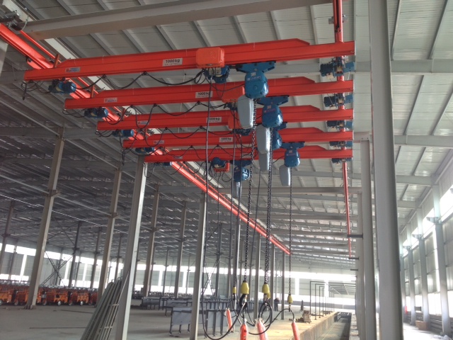 橋式起重機是橫架于車間、倉庫和料場上空進行物料吊運的起重設備。由于它的兩端坐落在高大的水泥柱或者金屬支架上,形狀似橋。橋式起重機的橋架沿鋪設在兩側高架上的軌道縱向運行,可以充分利用橋架下面的空間吊運物料,不受地面設備的阻礙。它是使用范圍**廣、數量**多的一種起重機械。