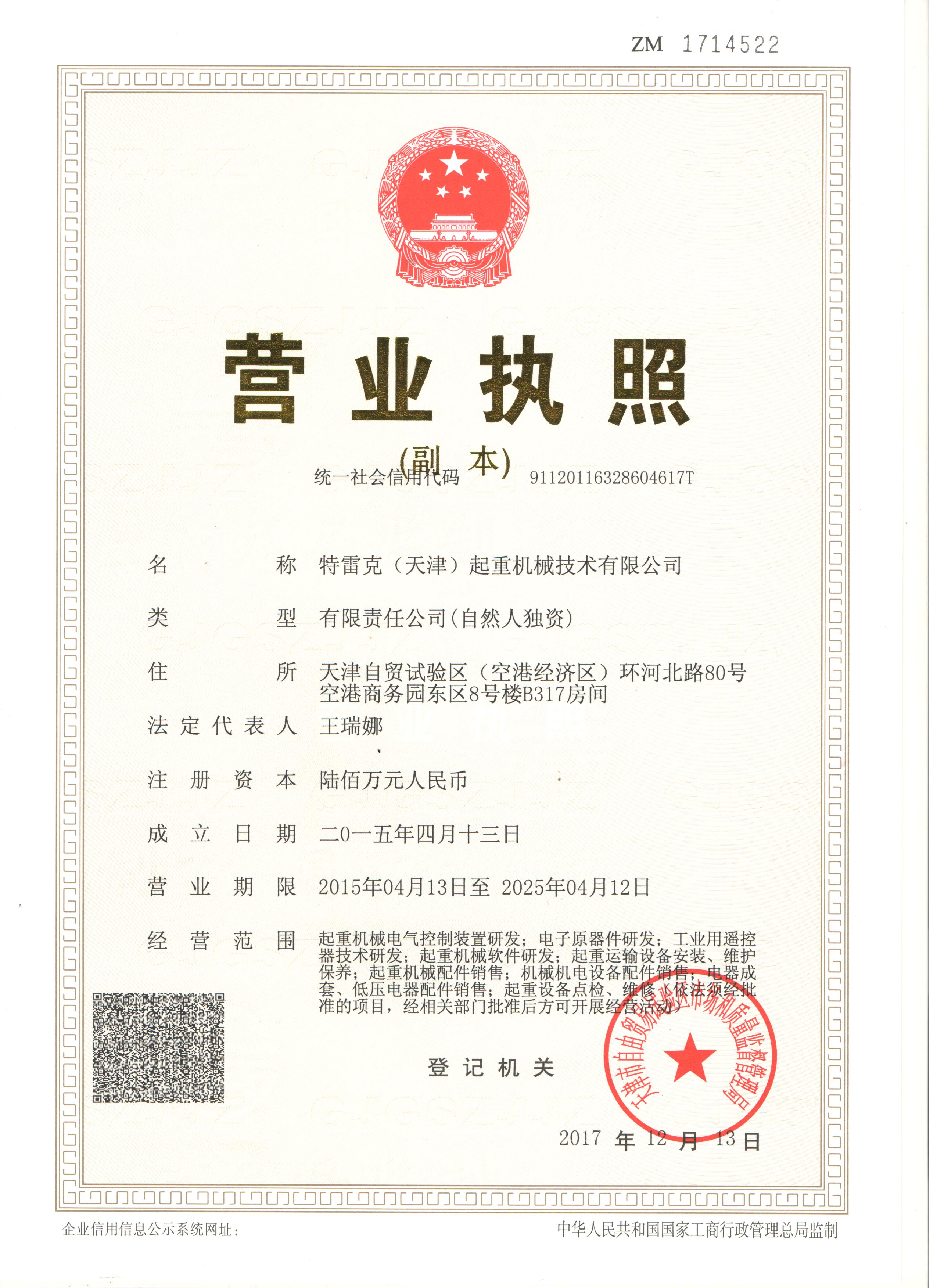 證書介紹 2015年特雷克(天津)起重機(jī)械技術(shù)有限公司正式成立,主營起重機(jī)械電氣控制裝置研發(fā),電子元器件研發(fā),工業(yè)用遙控器技術(shù)研發(fā),起重機(jī)械軟件研發(fā),起重運(yùn)輸設(shè)備安裝,維修和保養(yǎng),起重機(jī)械配件銷售,機(jī)械機(jī)電設(shè)備配件銷售,電器成套,低壓電器配件銷售,起重設(shè)備點檢維修等經(jīng)相關(guān)部門批準(zhǔn)可開展經(jīng)營**。