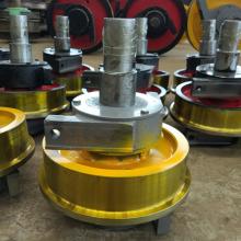 車輪組主要由車輪、軸、軸承箱組成。為便于安裝和維修,將車輪安裝在可整體拆卸接得角箱中,形成獨立部件。起重機運行機構車輪的水平偏斜值是起重機重要的技術參數,偏斜值超差會造成啃軌,增大運行阻力,產生振動和噪音,加劇軌道和車輪磨損,大大降低起重機使用壽命,所以各類起重機制造技術條件都要對車輪水平偏斜規定允許的數值車輪組使用注意事項:(1)車輪踏面磨損,車輪踏面磨損量超過原厚度的15%時應更換新件,沒超過此值,可重新車制、熱處理修復。車輪直徑應在公差范圍內,表面淬火硬度HB300~500,對車輪直徑大于Φ400mm的淬火層厚度應大于20mm;小于Φ400mm時,淬火層厚不應小于15mm。 (2)踏面橢圓度:車輪踏面橢圓度達1mm應報廢 (3)車輪組裝配:安裝好的車輪組件,應能手轉動靈活,安裝在同一平衡架上的幾個車輪**在同一垂直平面內,允許偏差為1mm