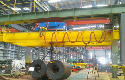 “橋式起重機是橫架于車間、倉庫和料場上空進行物料吊運的起重設備。由于它的兩端坐落在高大的水泥柱或者金屬支架上,形狀似橋。橋式起重機的橋架沿鋪設在兩側高架上的軌道縱向運行,可以充分利用橋架下面的空間吊運物料,不受地面設備的阻礙。它是使用范圍**廣、數量**多的一種起重機械。