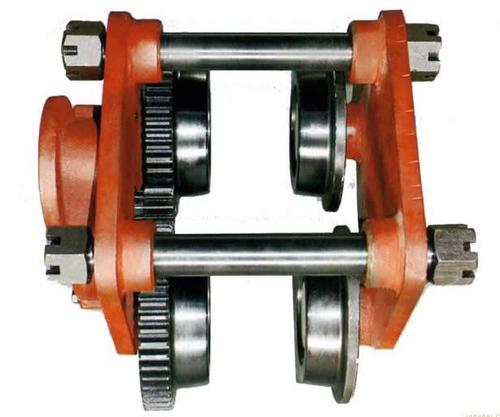 4、跑車運行時,小跑車被動輪碰到軌道端頭的緩沖器后停止運行。由于在主動輪的一邊沒有裝緩沖器,當被動輪停止運行時,主動輪慣性運行,導致小車產生偏斜。大部分情況下跑車都能自動復位,但當跑車車輪輪緣與工字鋼軌道外緣的間隙超標時,跑車**不能自動復位,會導致跑車啃軌。