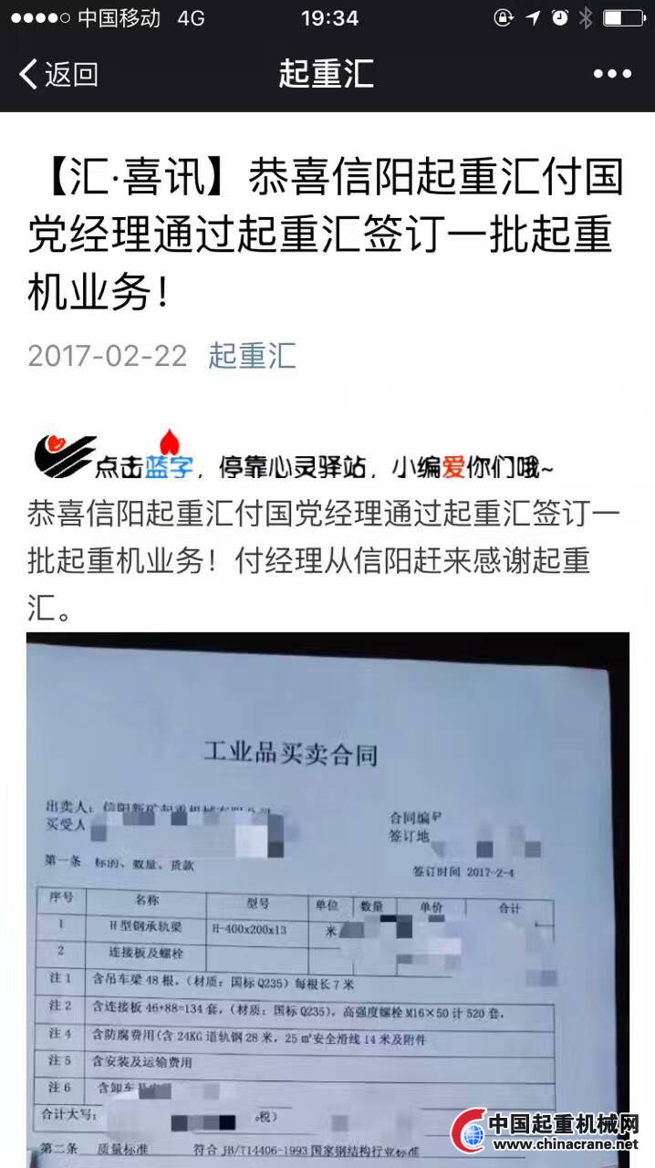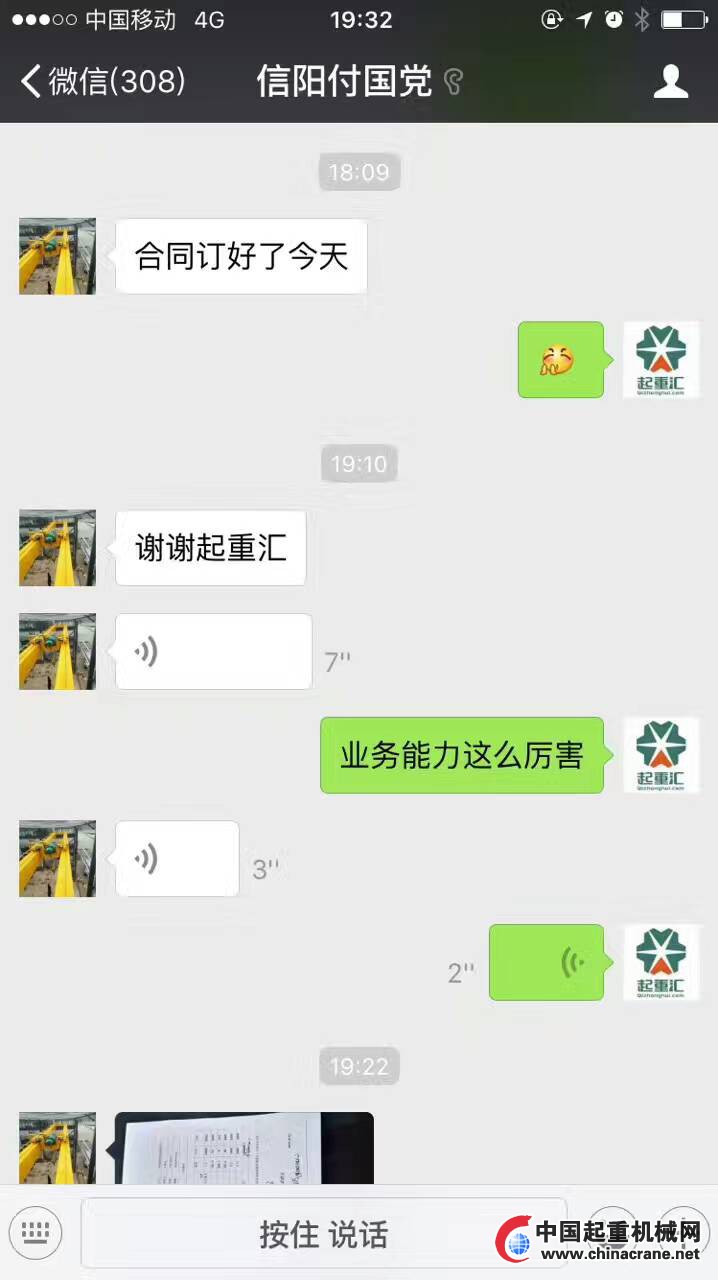 【匯.訂單】12號下午起重匯工作人員再次收到信陽付國黨經理的喜訊傳來,今年開春以來,付經理兵貴神速訂單連續不斷。大家深有體會一年之際在于春,起重精英們要把握機會!起重匯,與您同行!