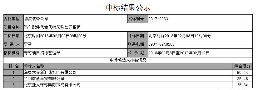 | 招標投標項目名稱: | 青海油田吊車配件代儲代銷采購公開招標公告 | ||||||||