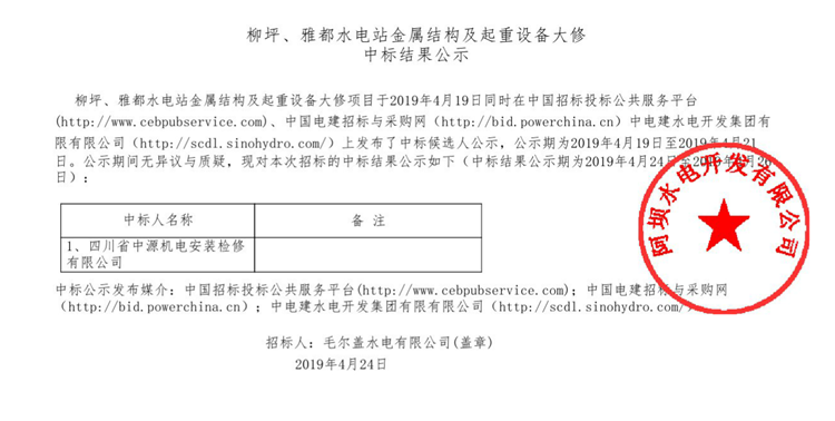 柳坪水電站柳坪雅都水工機械設(shè)備及起重設(shè)備大修中標結(jié)果公示