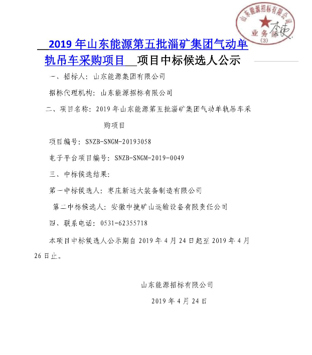 移動版:【2019年山東能源第五批淄礦集團氣動單軌吊車采購項目】中標候選人公示
