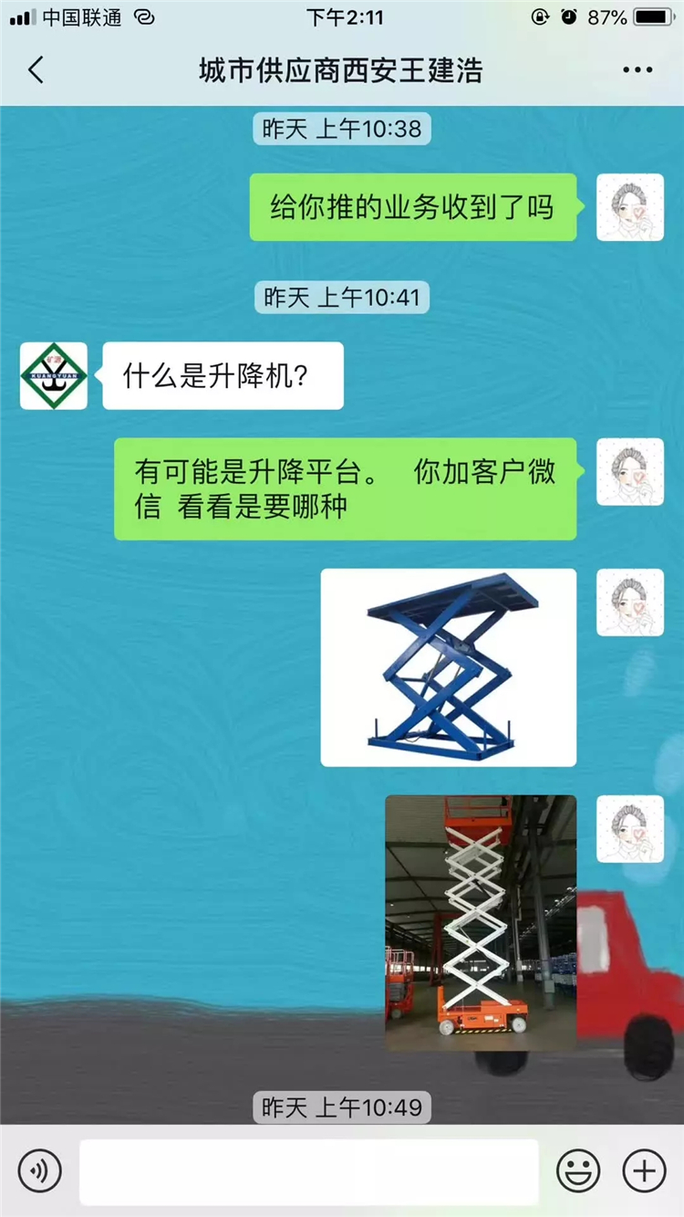 王經理本周一加入的城市供應商,昨天周五收到了第一條派送業務,當天談成,采購單位直接打款訂購了兩臺升降平臺,今天貨已到西安。好的開始,預祝以后簽單多多!