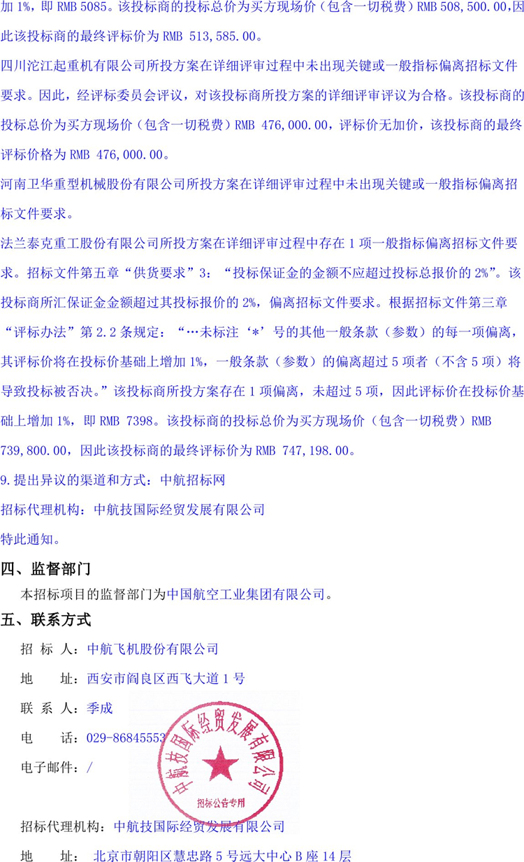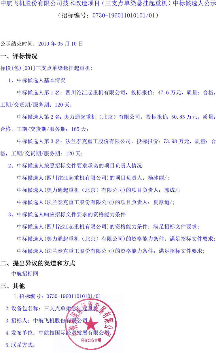 移動(dòng)版:中航飛機(jī)股份有限公司技術(shù)改造項(xiàng)目(三支點(diǎn)單梁懸掛起重機(jī))中標(biāo)候選人公示