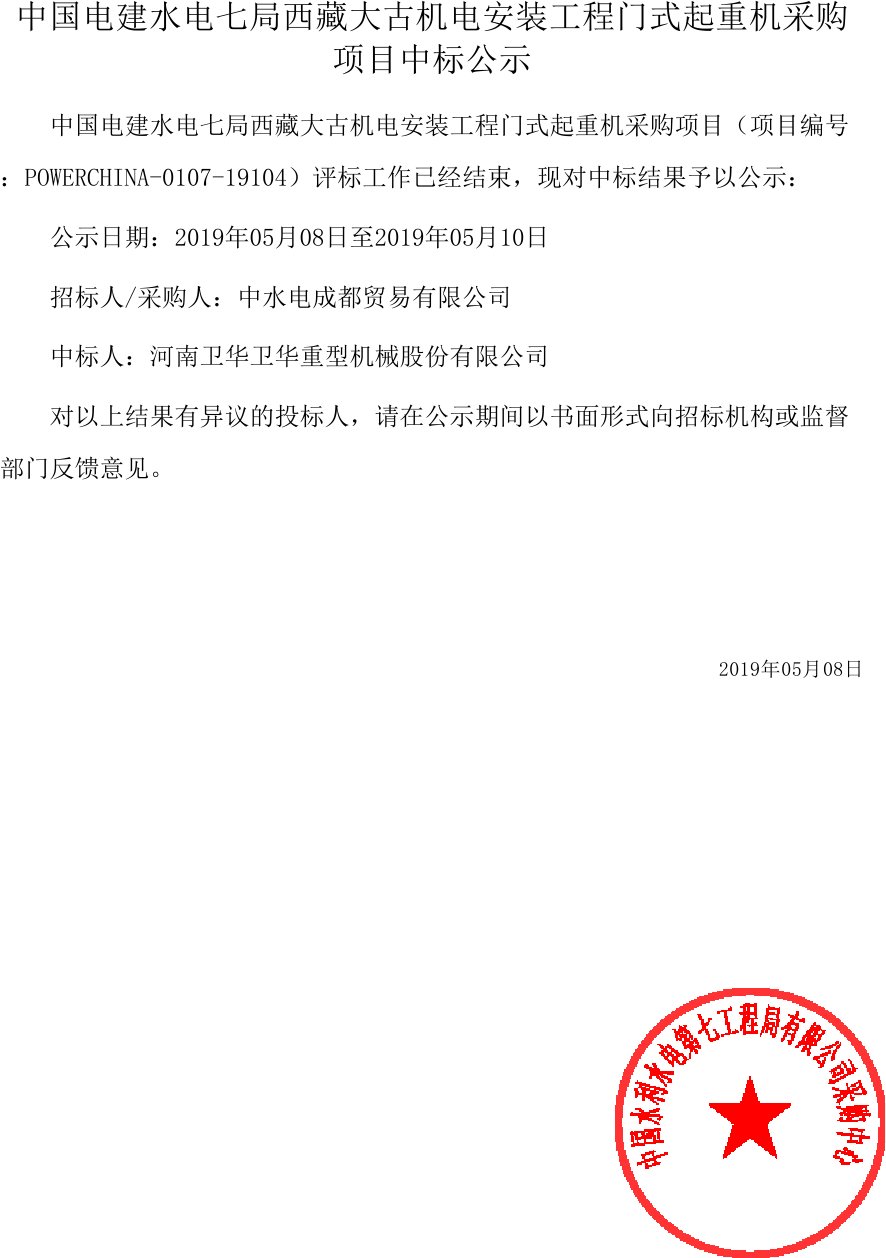 中國(guó)電建水電七局西藏大古機(jī)電安裝工程門式起重機(jī)采購(gòu)項(xiàng)目中標(biāo)公示