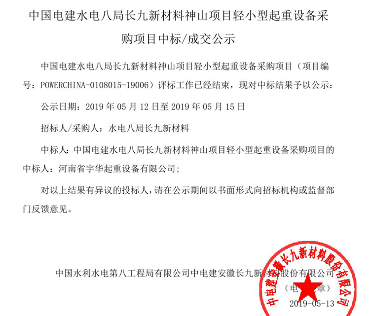 中國電建水電八局長九新材料神山項目輕小型起重設備采購項目成交公示