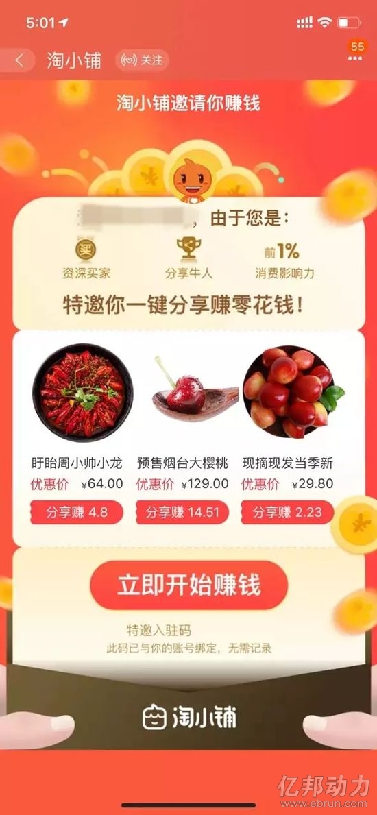 了解到,用戶必須有邀請碼才可開通淘小鋪,用戶下載淘小鋪成為掌柜后,可自行選擇商品上架,銷售商品后即可獲得相應比例的收益。淘小鋪官方將此舉措定義為“一鍵創業”。