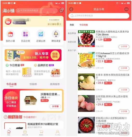 用戶注冊淘小鋪后可發現,其App首頁包含“今日限量”、“品牌折扣”、“今日爆賣”、“限時折扣”和“熱銷榜”等板塊,還可在首頁直接查看貨品分類和店鋪業績等。目前淘小鋪主要覆蓋的品類包括食品、母嬰、美妝、服飾等。