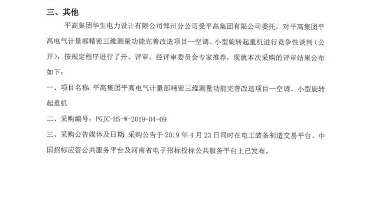 平高集團平高電氣計量部精密三維測量功能完善改造項目—空調、小型旋轉起重機評審結果公示