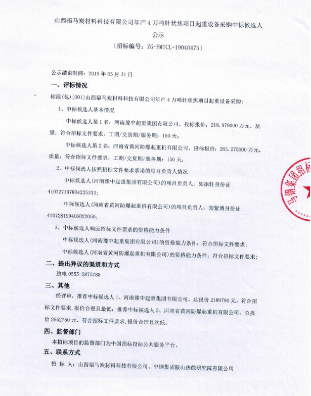 山西福馬炭材料科技有限公司年產4萬噸針狀焦項目起重設備采購中標候選人公示