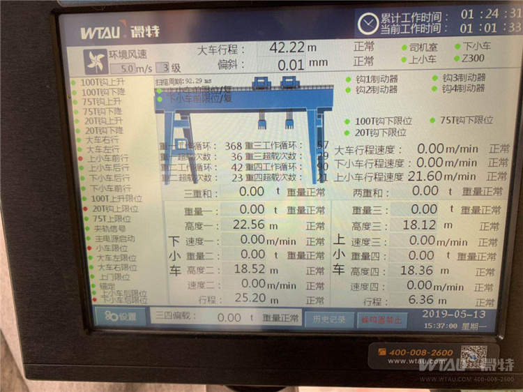完工后的監控系統對吊點區域實時監控,大車行程全方位在線監控,小車形成數據行程顯示在儀表界面,達到各限位點后實時監控,司機為我們的監控系統點贊。