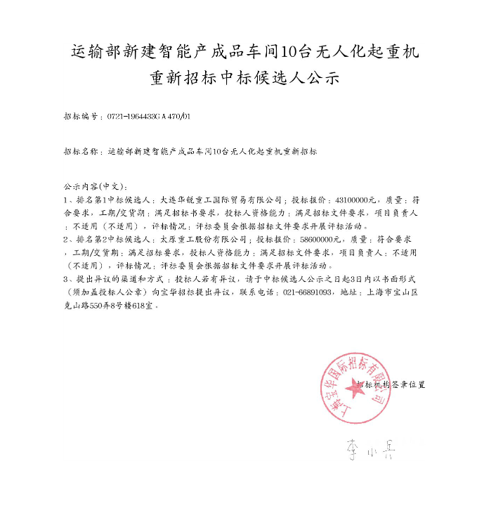 移動版:運輸部新建智能產成品車間10臺無人化起重機重新招標中標候選人公示