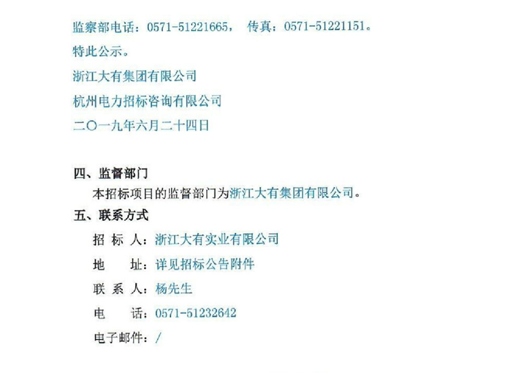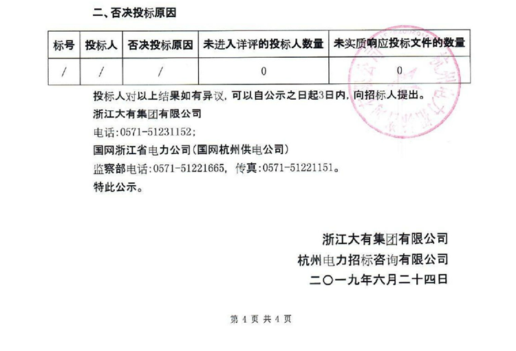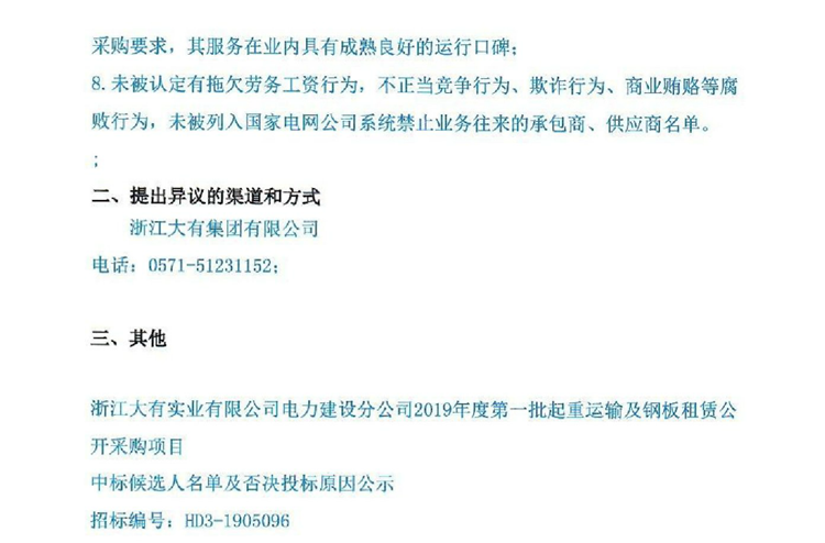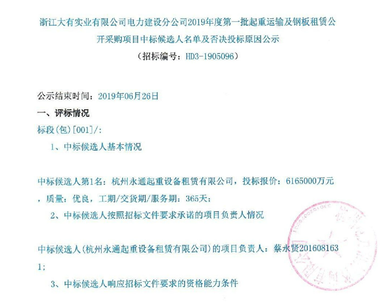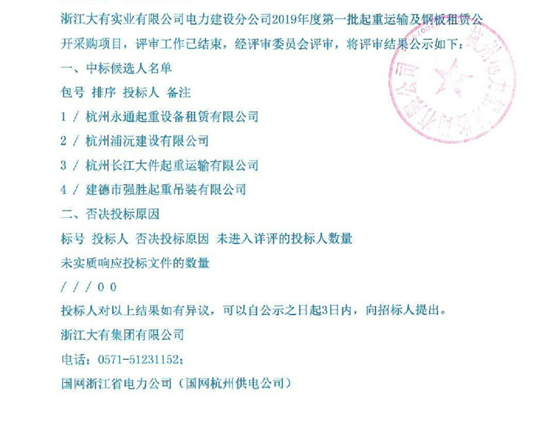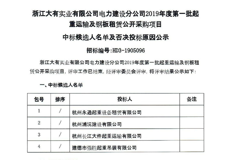 移動版:浙江大有實業有限公司電力建設分公司2019年度第一批起重運輸及鋼板租賃公開采購項目中標候選人名單及否決投標原因公示