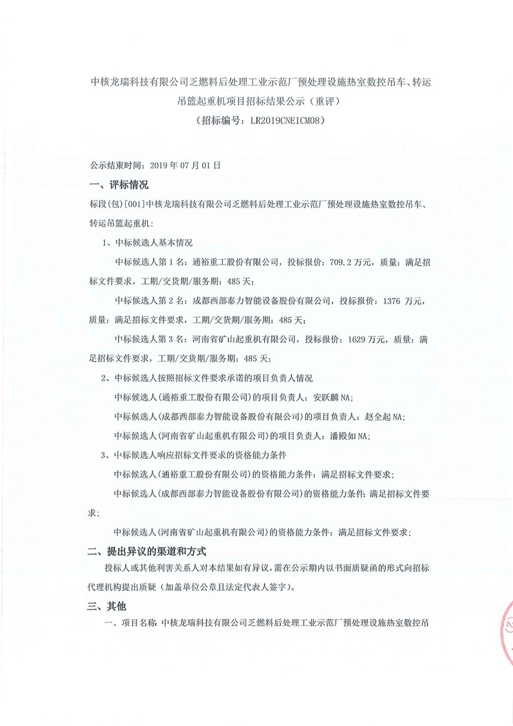 中核龍瑞科技有限公司乏燃料后處理工業示范廠預處理設施熱室數控吊車、轉運吊籃起重機項目招標結果公示(重評)