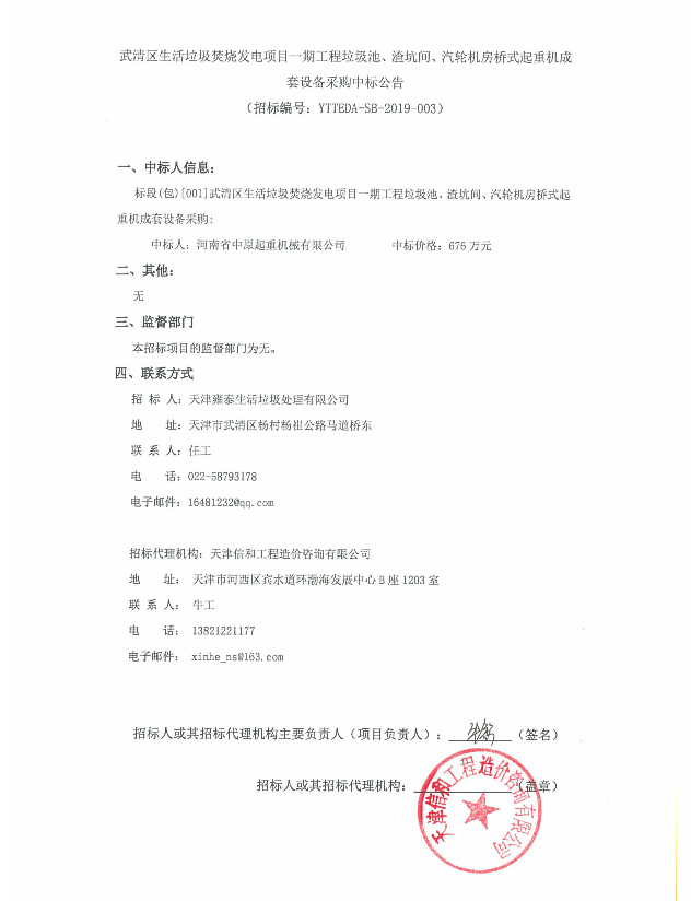 武清區生活垃圾焚燒發電項目一期工程垃圾池、渣坑間、汽輪機房橋式起重機成套設備采購中標公告