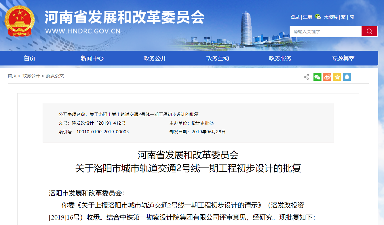 7月10日,記者從河南省發改委網站獲悉,省發改委發布豫發改設計〔2019〕412號文件,對洛陽市城市軌道交通2號線一期工程初步設計進行批復。批復文件顯示,原則同意中鐵第四勘察設計院集團有限公司編制的工程初步設計及修改設計。