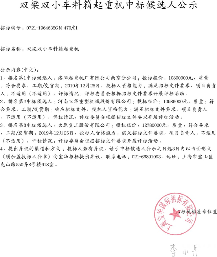 雙梁雙小車料箱起重機中標(biāo)候選人公示