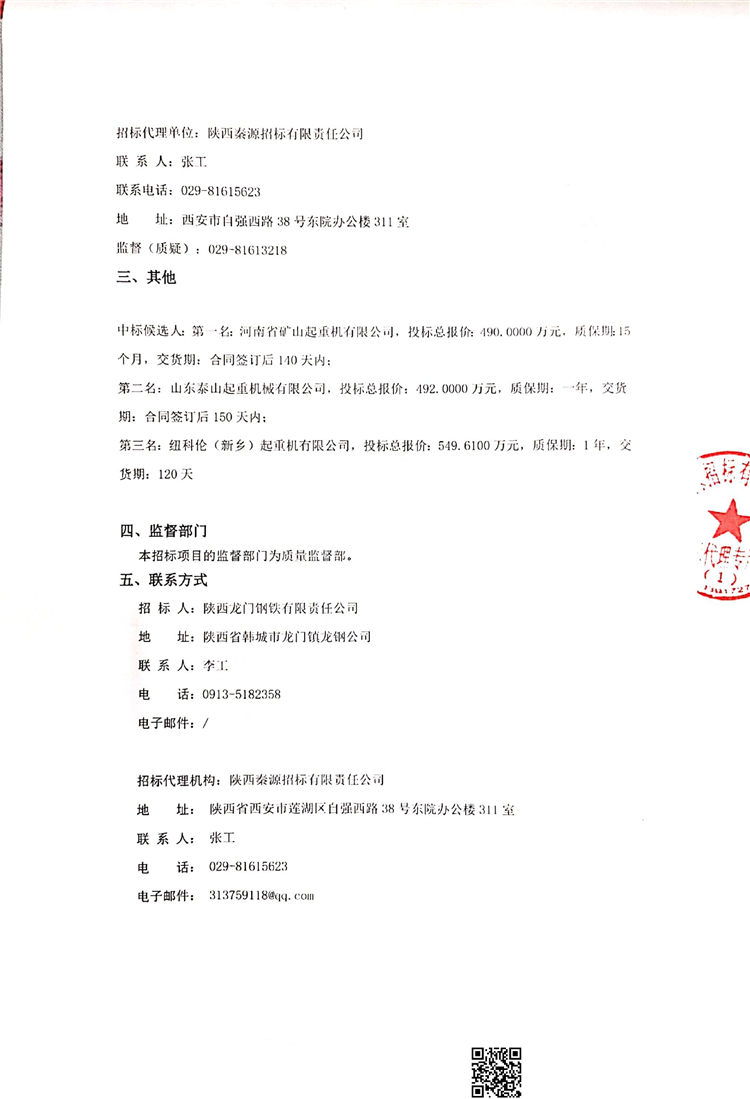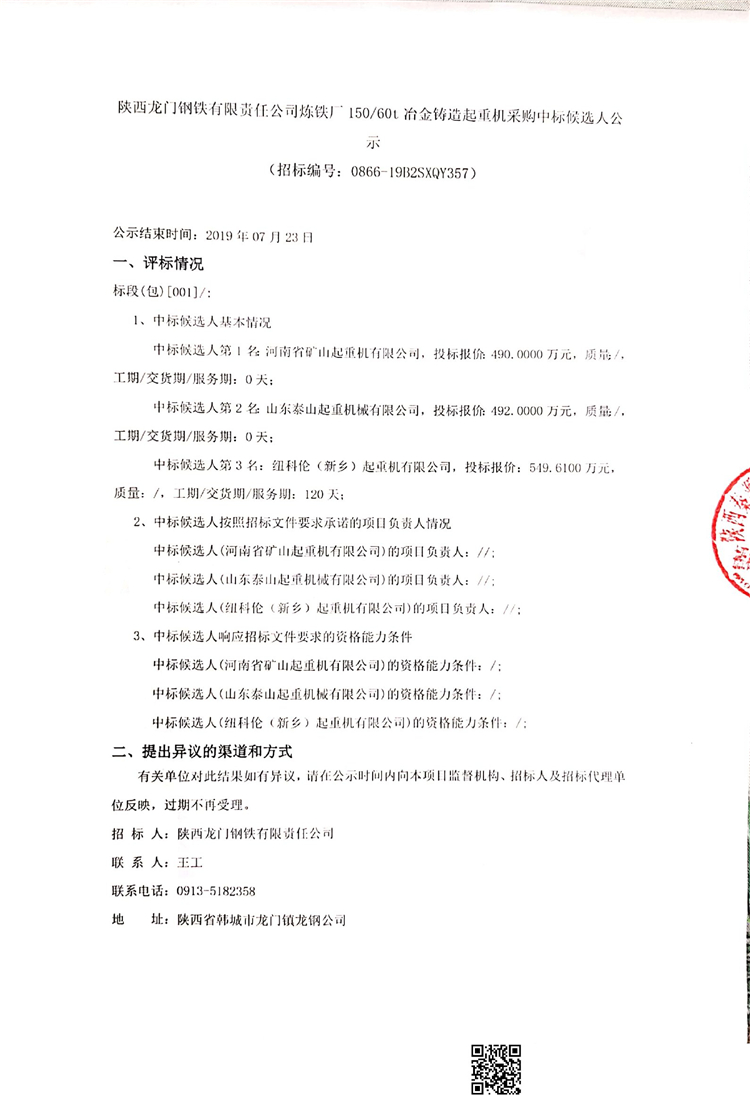 陜西龍門鋼鐵有限責任公司煉鐵廠150/60t冶金鑄造起重機采購中標候選人公示