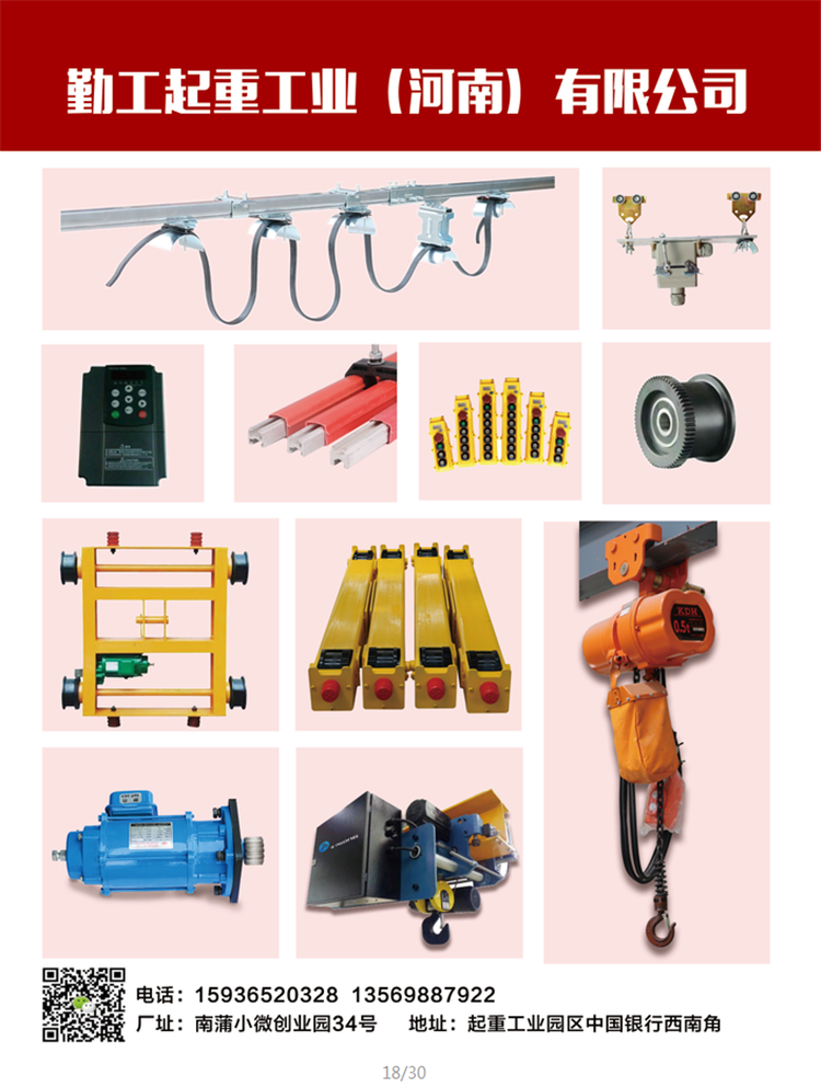 勤工起重主營C型鋼,環鏈葫蘆,變頻器,三合一電機,臺車,滑線等起重配件,產品每年不斷出口,走出國門,受到國外客戶的好評并保持長期合作。采購熱線:15936520328孫經理